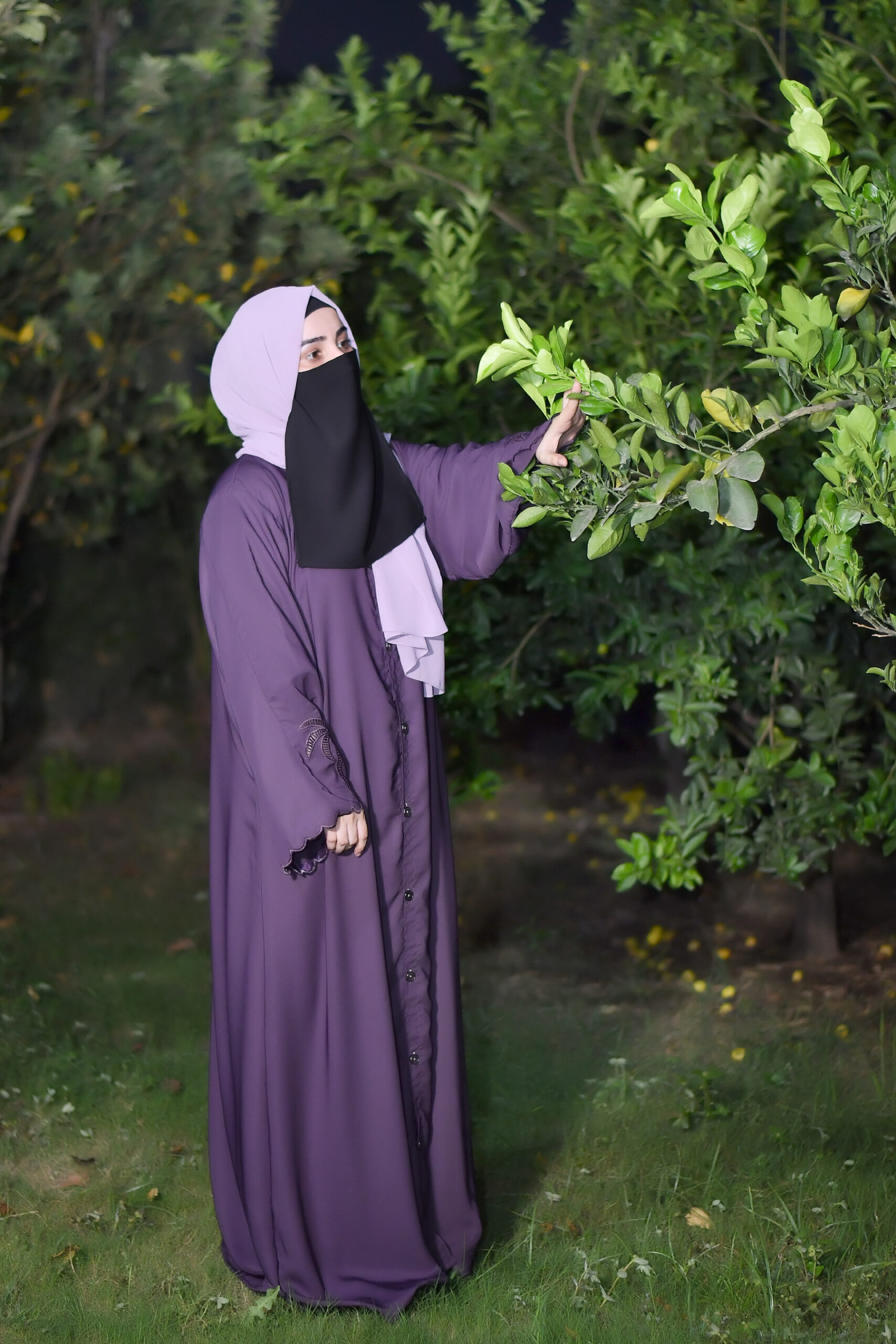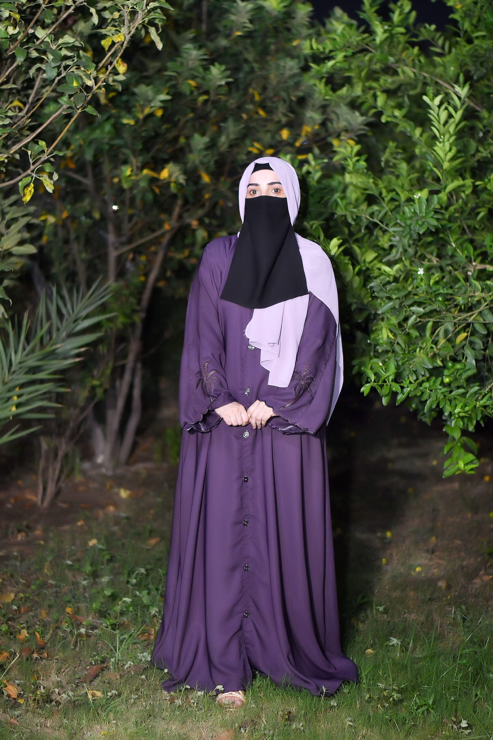 This stunning Premium Nida abaya in rich lavender exudes elegance with its flowing, floor-length design and loose silhouette, offering full coverage and comfort. The sleeves feature delicate embroidered floral adding a subtle, intricate touch.