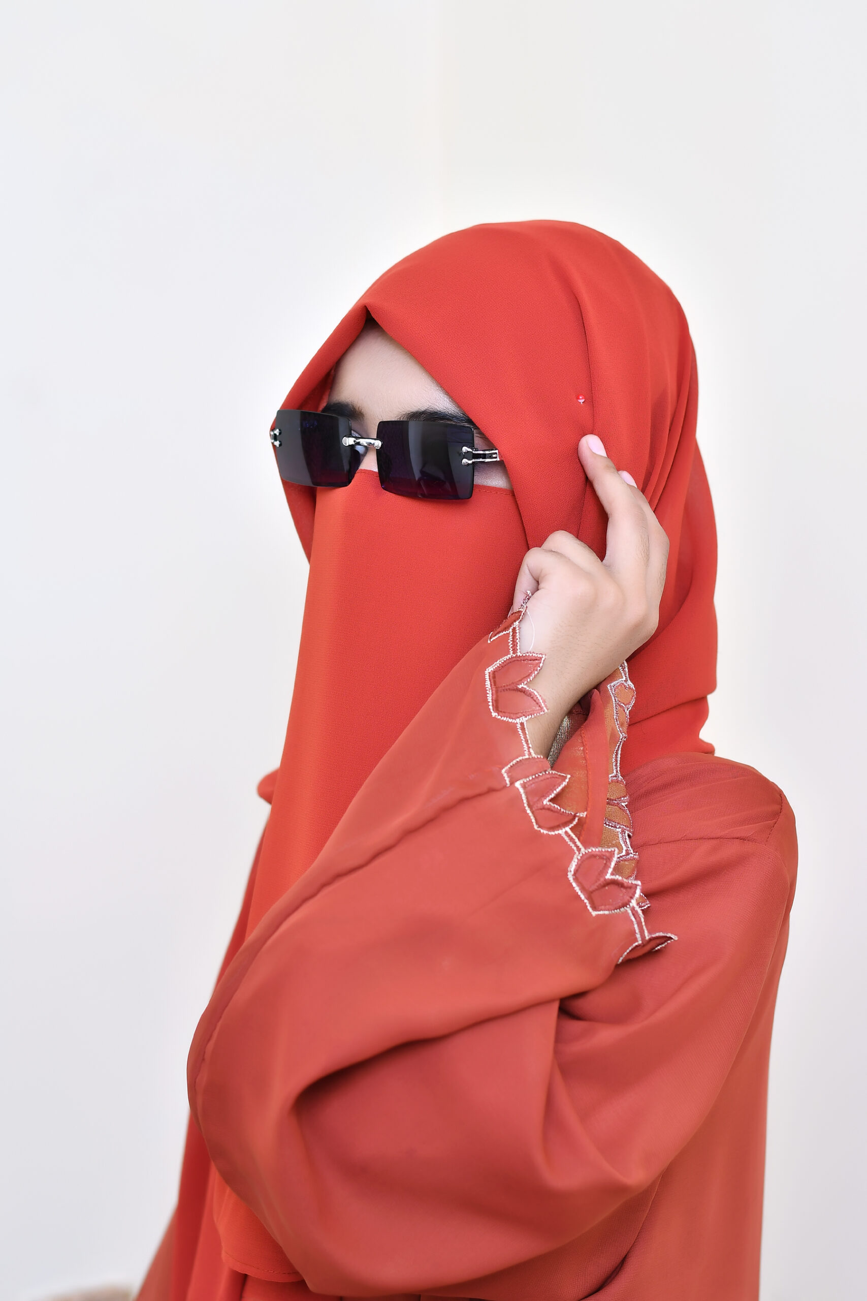 This double Chiffon abaya in a rich rust color features intricate rust and soft gild leaf-shaped embellishments along the sleeve edges.