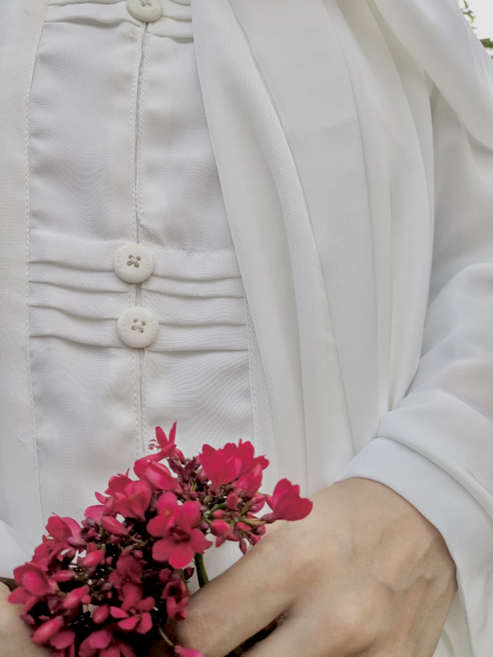 Modesty meets elegance with beautiful pintuck pleats and classic button details. This simple yet sophisticated design offers a respectful and graceful appearance, perfect for the holy sites.