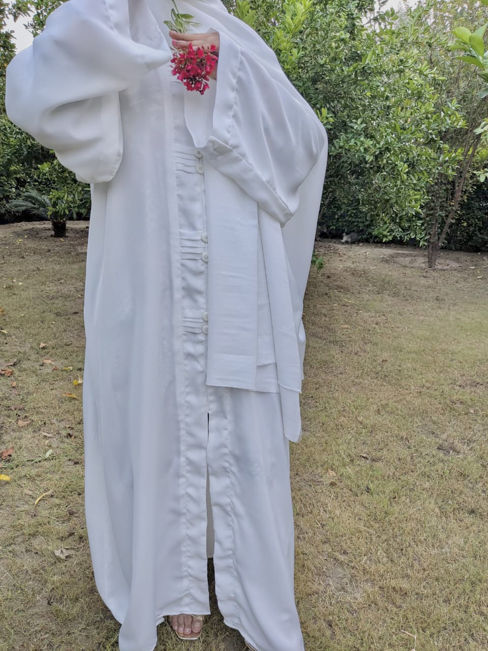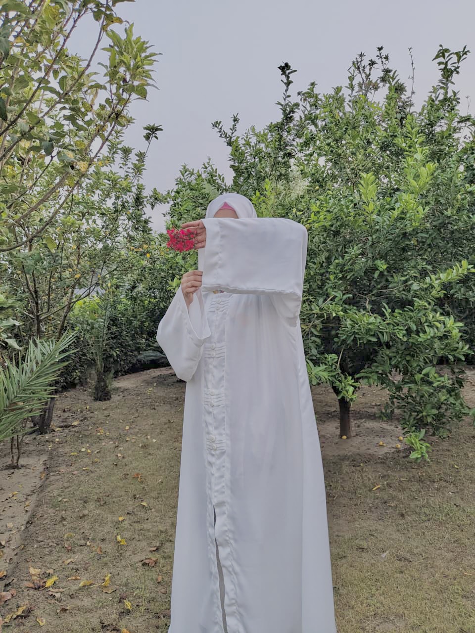 This elegant abaya, crafted from premium Nida fabric in a serene white color, embodies the purity and simplicity cherished during Umrah. Its flowing, modest silhouette with a front button closure and soft draping reflects the spiritual grace of the pilgrimage, perfect for the sacred journey.