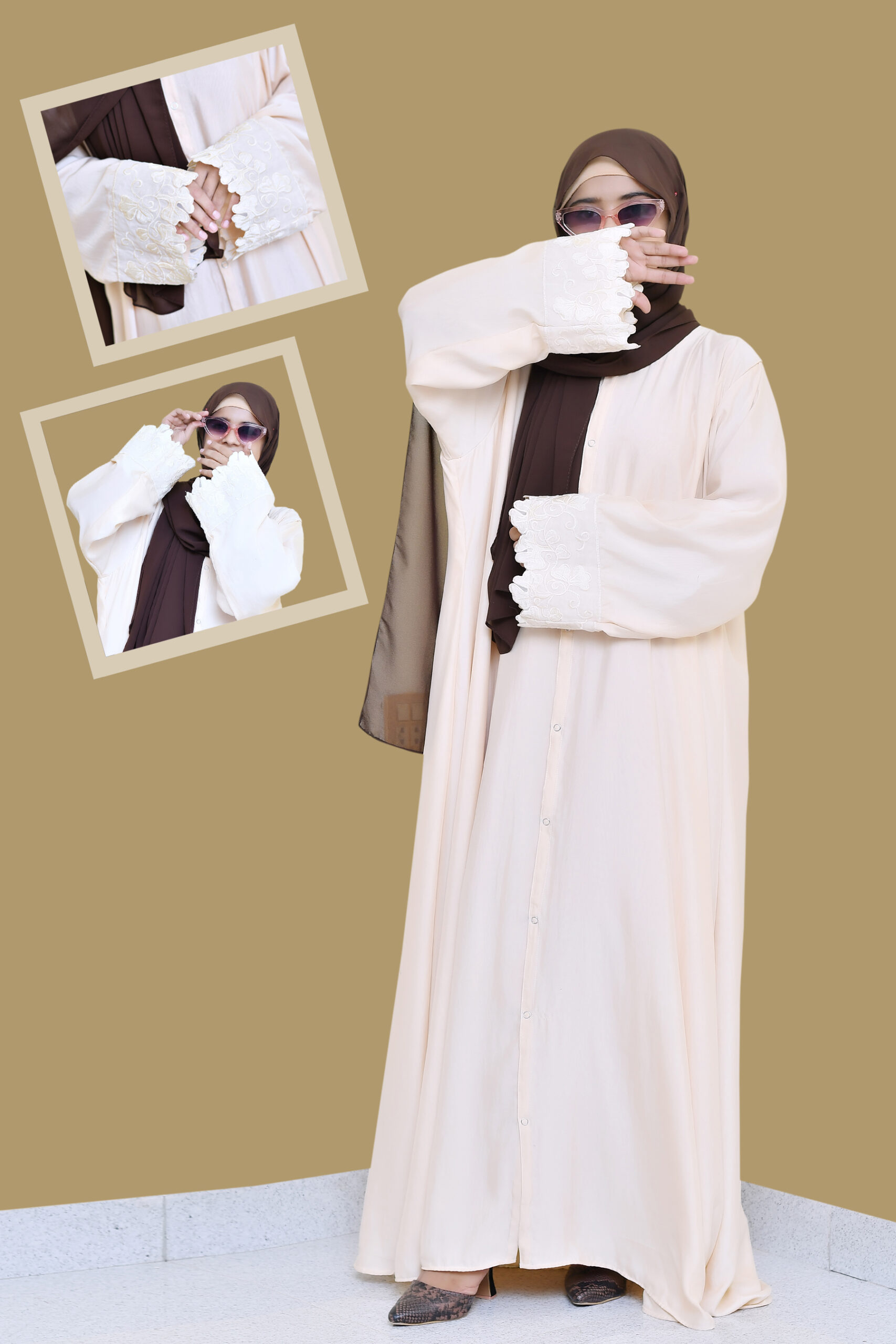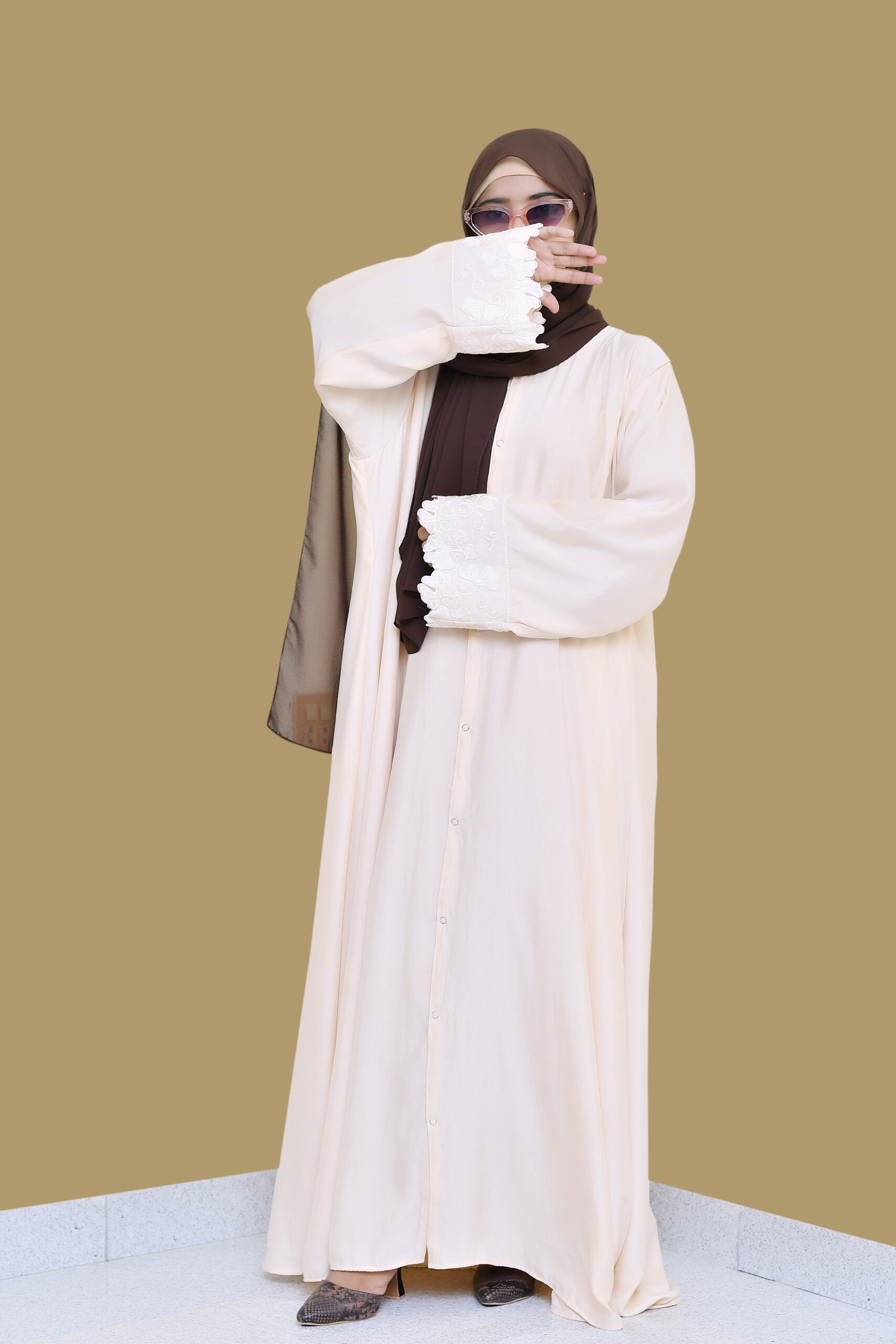This elegant abaya features a soft, creamy beige base that exudes understated sophistication. The standout detail is the intricately embroidered lace cuffs, adorned with delicate floral patterns in white, adding a touch of timeless charm and texture