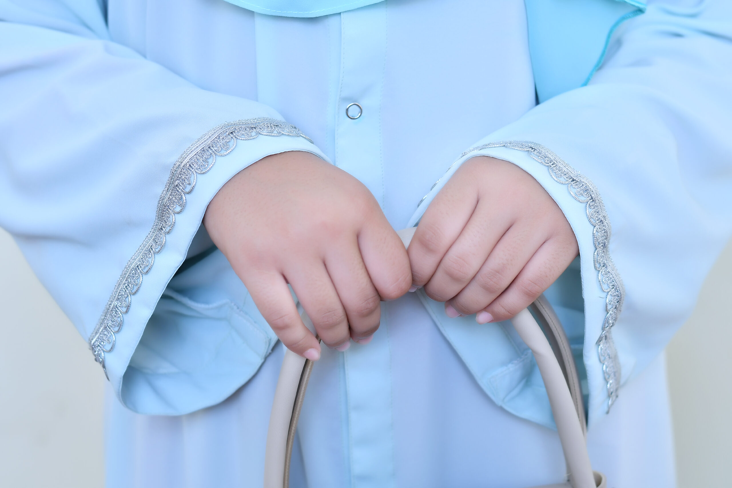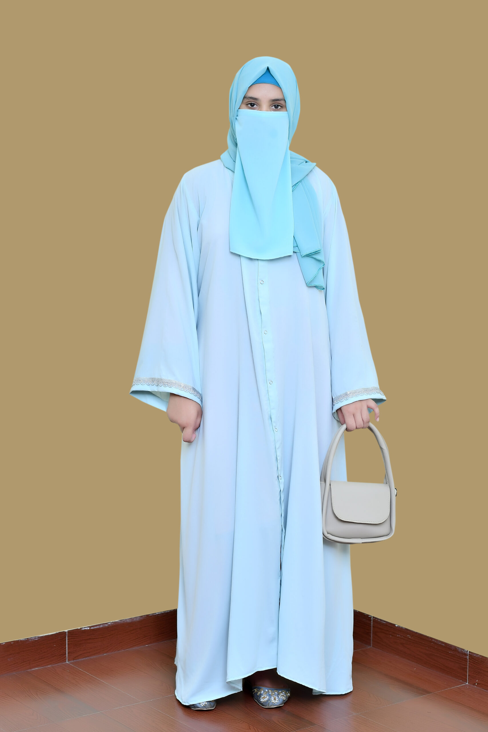 This georgette abaya features a soft pastel sky color with silver lace on the cuffs.