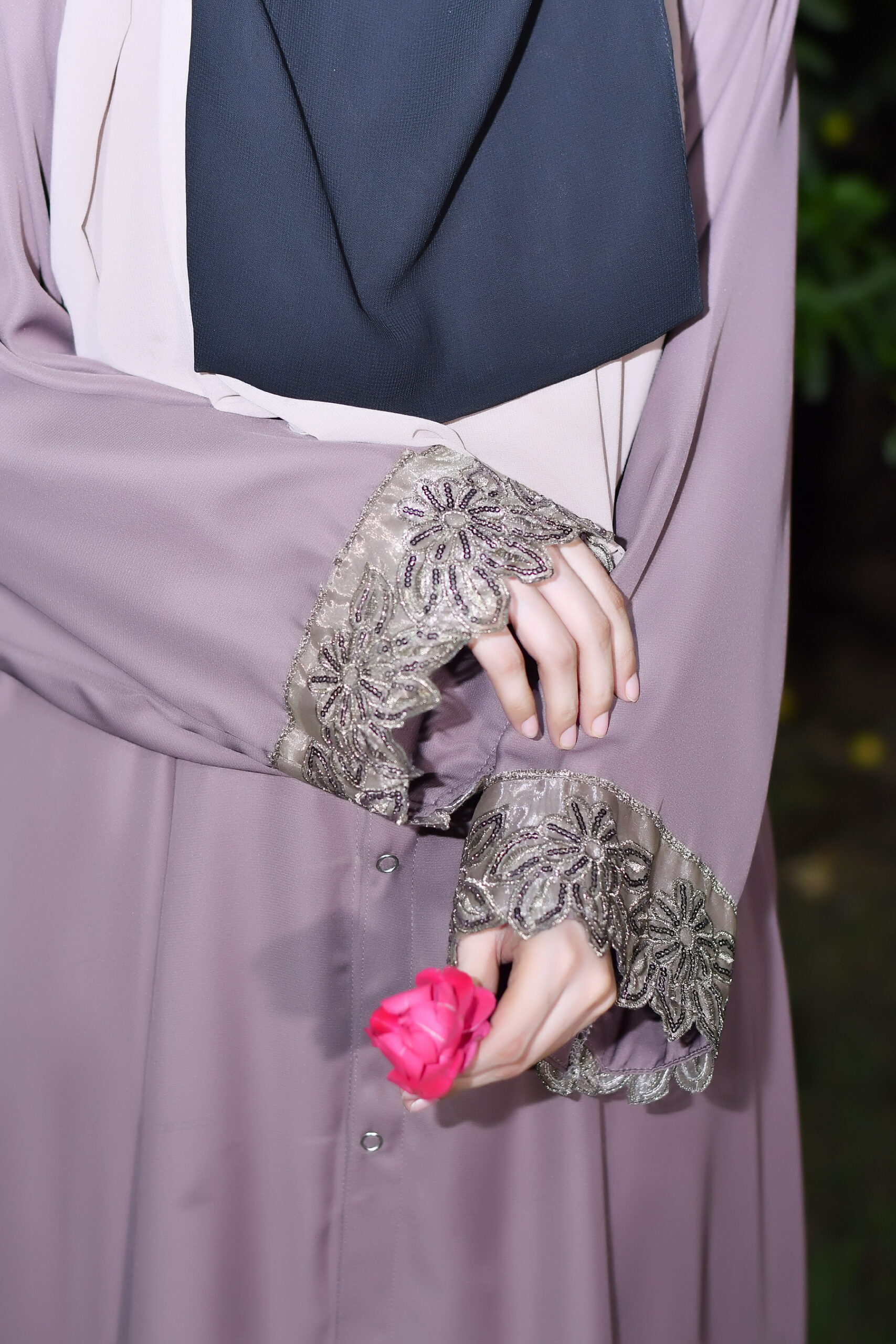 From the delicate floral lace on the cuffs to the flawless stitching, every element of this abaya is designed with precision, showcasing a true masterpiece of modest fashion.